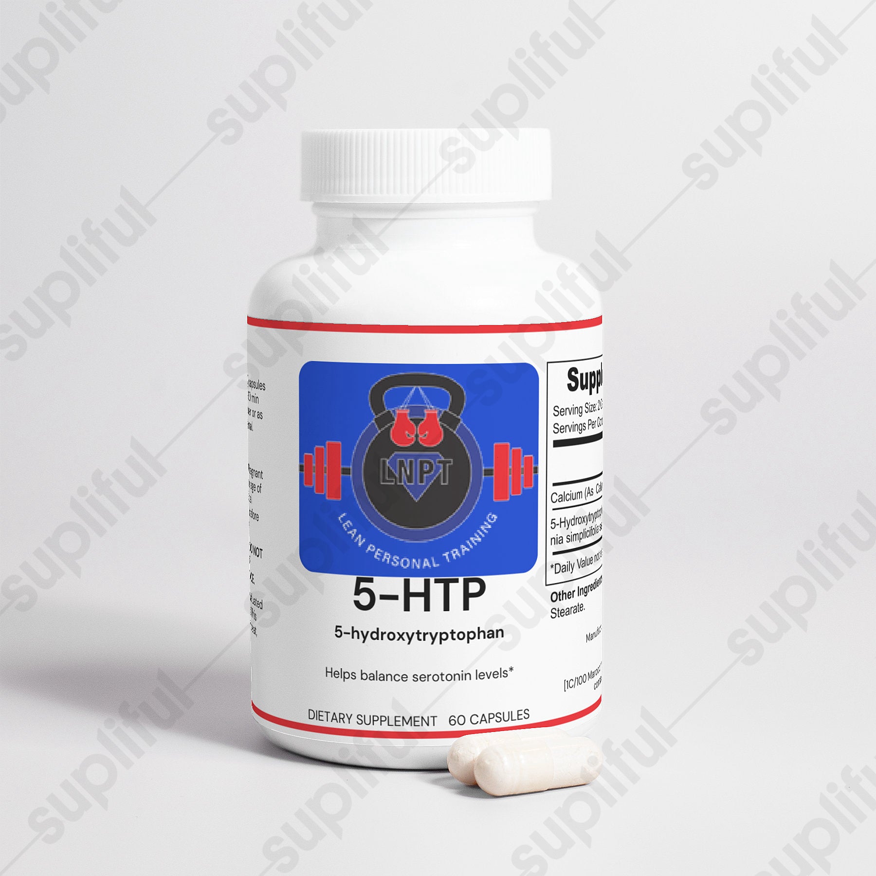 Ingredients: Calcium (as Calcium Carbonate), 5-Hydroxytryptophan (from Griffo via simplicifolia seed extract), Gelatin (capsule), Magnesium Stearate.