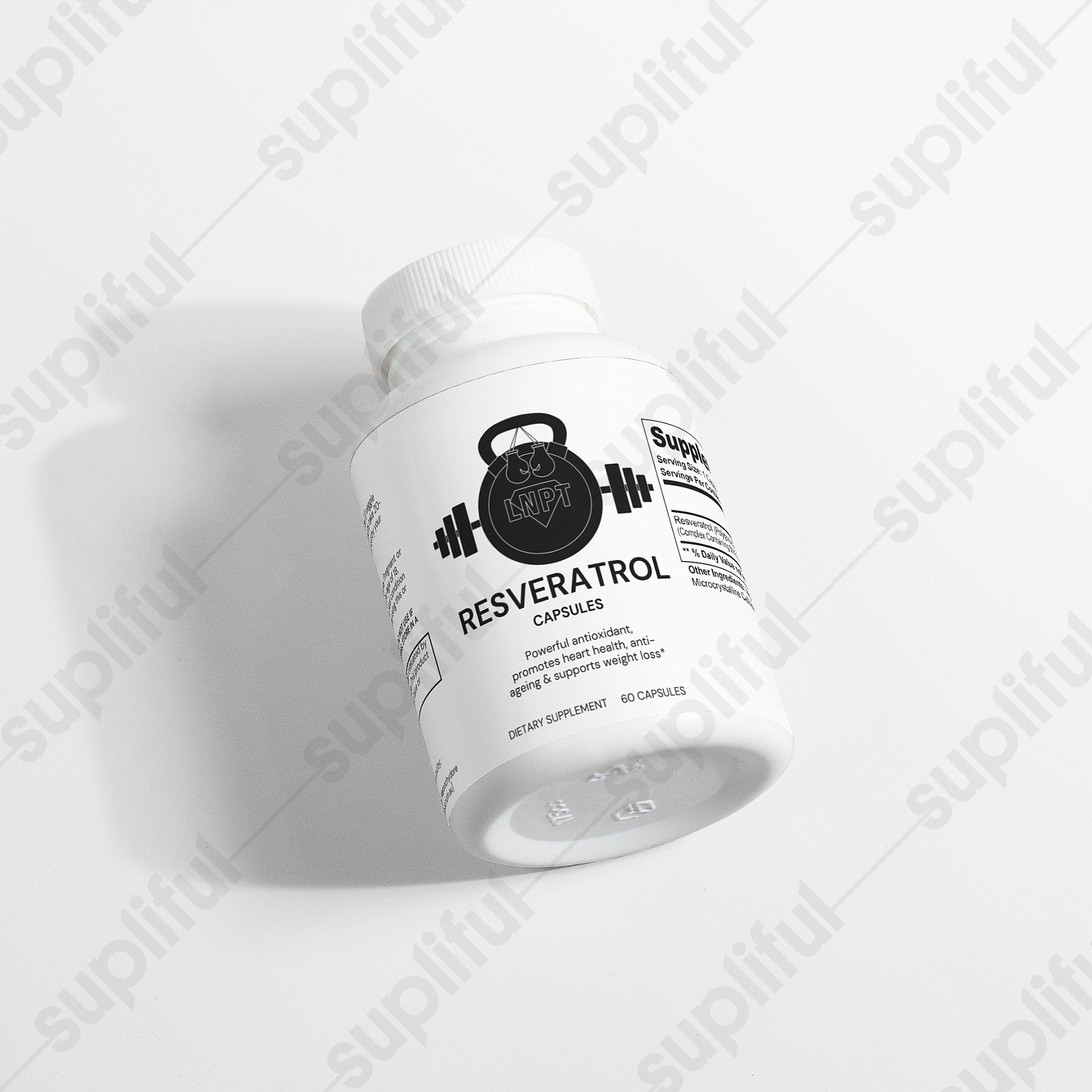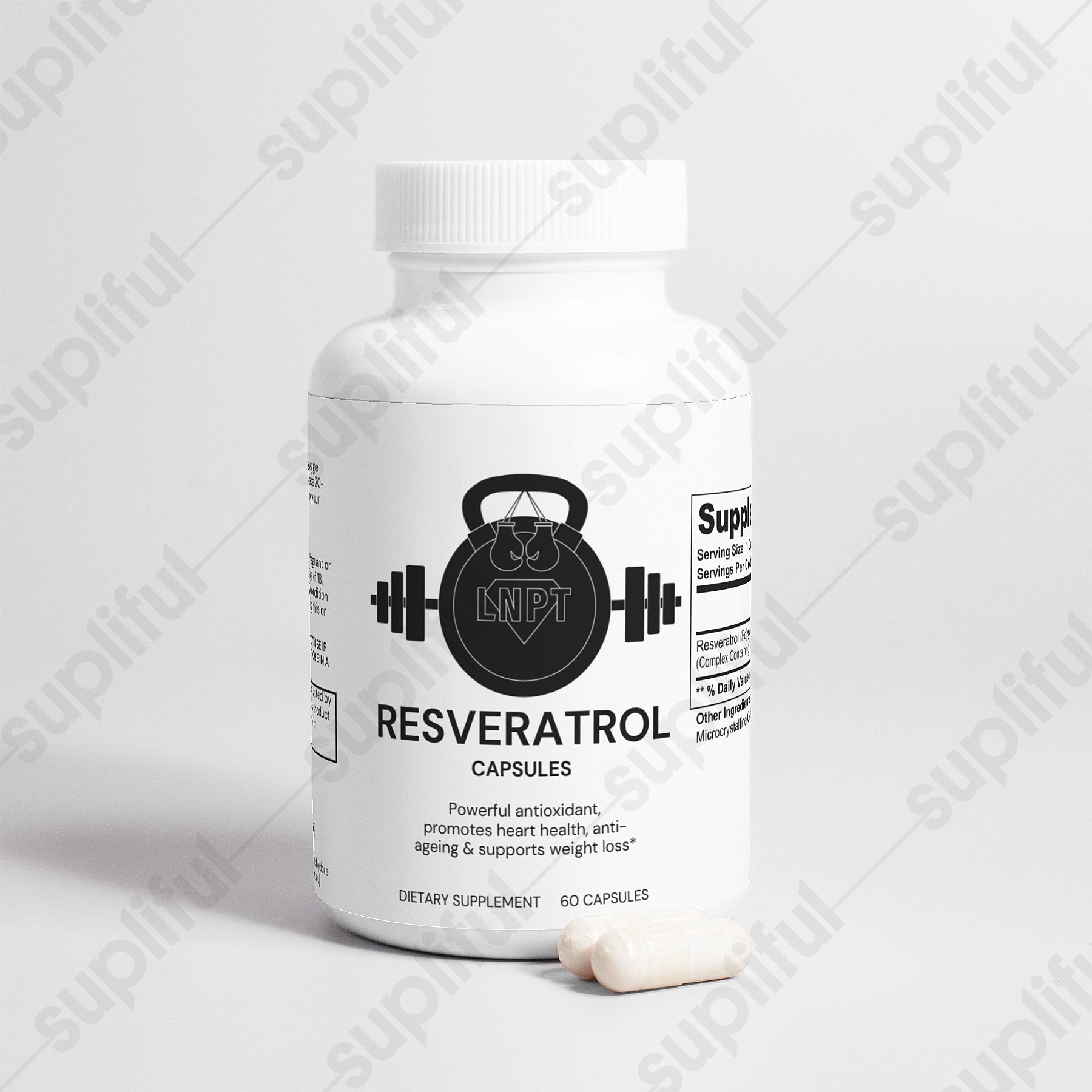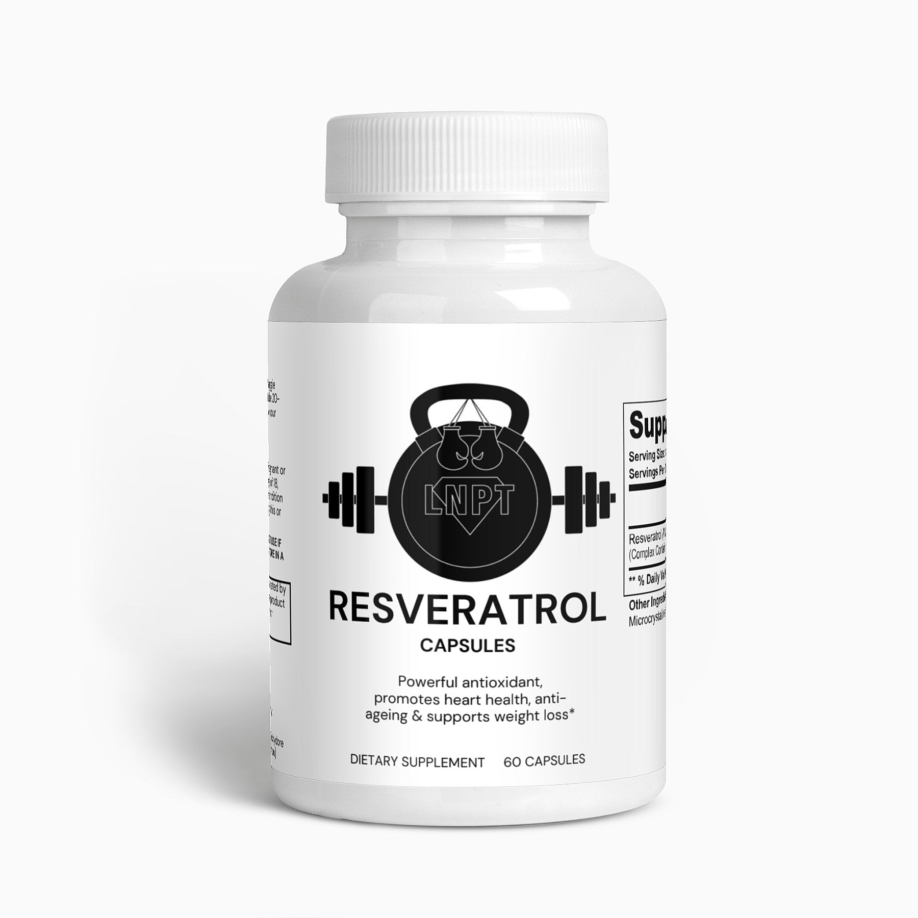 Ingredients: Resveratrol (Polygonum cuspidatum)(root) Complex Containing 50% Trans-Resveratrol, Vegetable Capsule (Cellulose), Microcrystalline Cellulose.